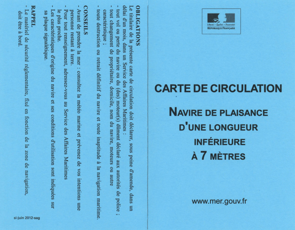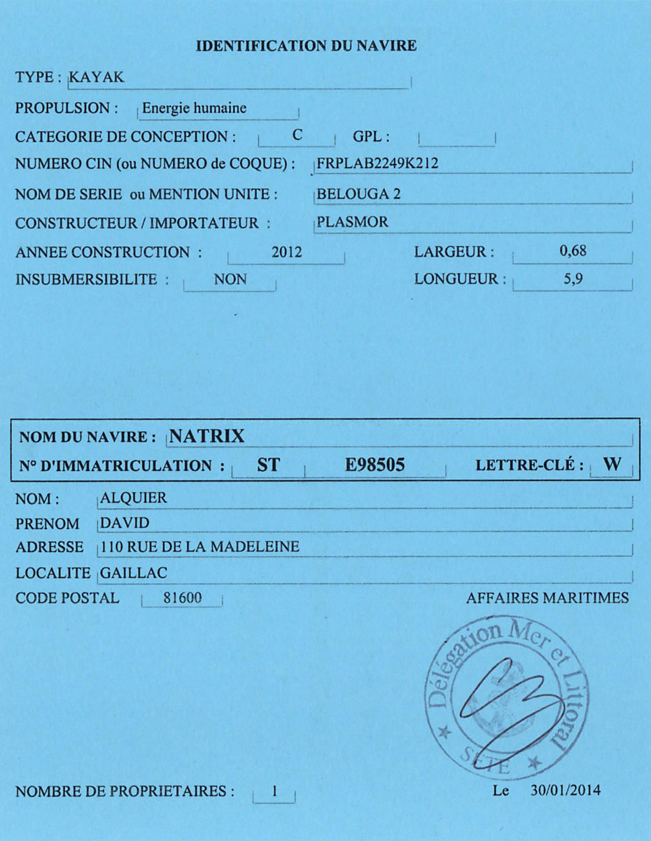 Pour le moment, je n’ai pas spécialement envie d’aller tout seul en mer, je ne la connais pas assez, et c’est vraiment pas demain non plus que j’en serai capable ! Après, on ne sait jamais, je peux être tenté par une petite virée sans forcement partir trop loin, avec une météo bien comme il faut… Le kayak étant homologué comme ayant la capacité à naviguer jusqu’à 6 miles nautiques d’un abri (environ 11 kilomètres), j’ai fait les démarches nécessaires pour obtenir ce petit papier bleu nommé « Carte de circulation – Navire de plaisance d’une longueur inférieure à 7 mètres » qui permet avec l’équipement adéquat de s’éloigner au delà de 300 mètres des côtes.