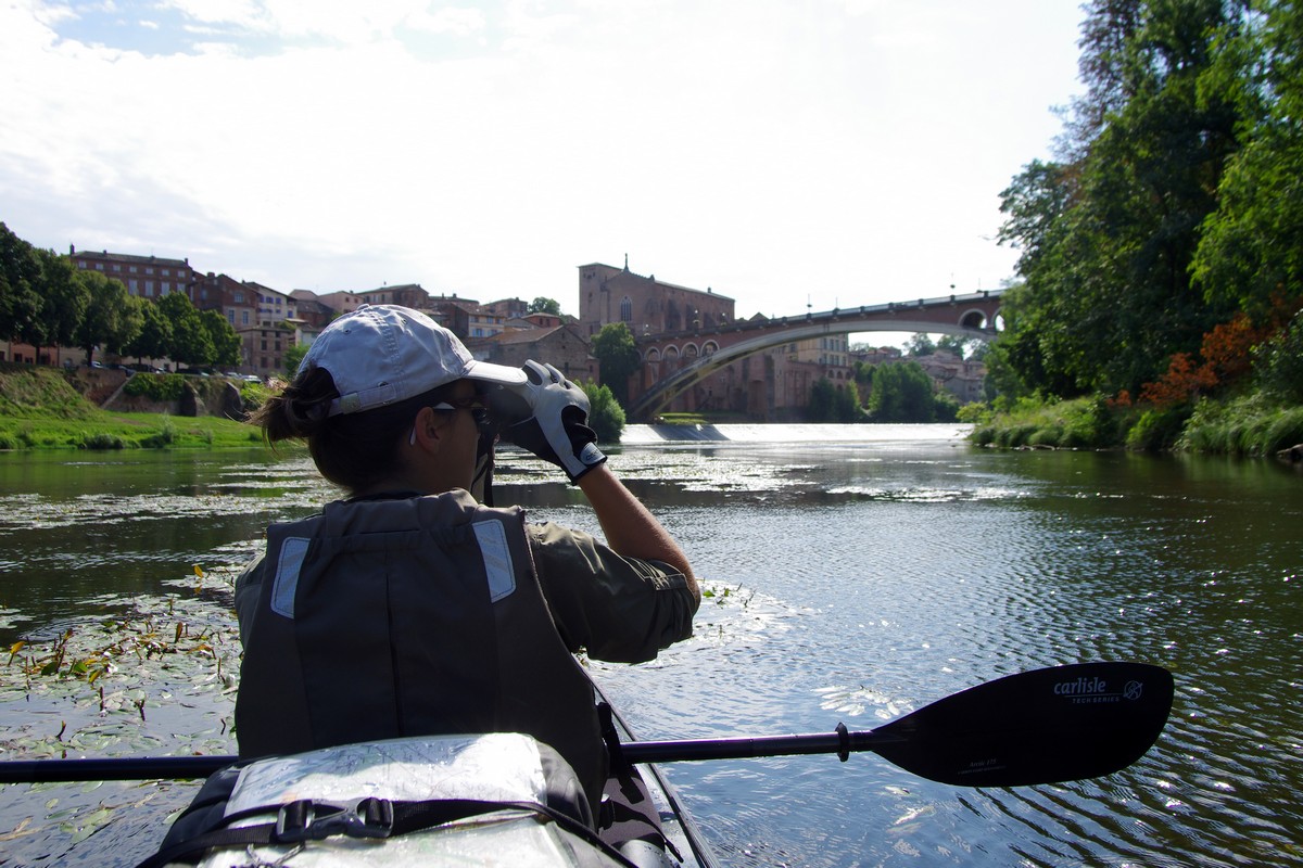 Un fois la mise à l’eau effectuée, nous avons remonté la rivière vers la digue, toujours afin de trouver des traces de loutres, et de récolter des exuvies de libellules, vous l’aurez tous compris ! Hors de question pour nous de charger une caisse de Gaillac pour aller la vendre à Bordeaux… Je me suis donc retrouvé, avec Julie, en aval du pont de l’Abbaye de Gaillac, pont sur lequel, encore un fois, je passe bien souvent en voiture, ou à pieds pour observer les oiseaux. Le point de vue du milieu de la rivière est toujours aussi surprenant, surtout lorsque qu’on est habitué à un lieu. J’ai beaucoup aimé cette petite viré en amont des quais, malgré la lumière en contre-jour fort peu avantageuse à cette heure de la matinée et qui m’a empêchée de faire des photos correctes, comme vous le verrez ci-dessous…