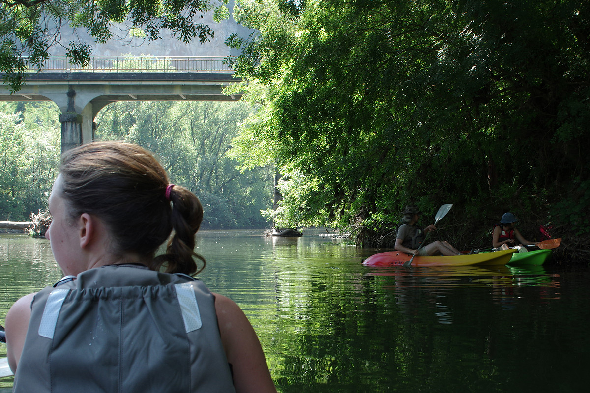 Après avoir mangé tous ensemble, nous avons séparé les naturalistes présents en petits groupes de prospections. Pendant que les uns arpentaient les quelques petits ruisseaux affluents de la Vère, d’autres avaient pour mission de tester un protocole mis en place par une demoiselle en thèse au Conservatoire des Espaces Naturels. Nous avons consacré l’après-midi entier à essayer de mesurer sur une berge un tronçon de 100m et de le découper en tronçons de 10m à l’aide de nos GPS… Et c’est dans ces moments-là que l’on se rend compte que la technologie ne fait pas tout… Nos appareils n’étant pas assez précis, nous avons eu recours à de bonnes vieilles méthodes pour établir les mesures, à l’aide d’une pagaie, puis d’une corde… Pas facile d’être scientifique… Je préfère de loin rester un humble touriste et laisser les jeunes faire ce genre d’expérience…