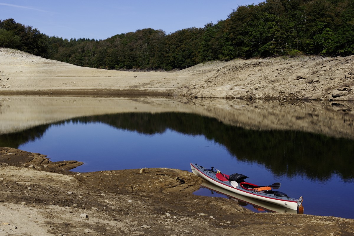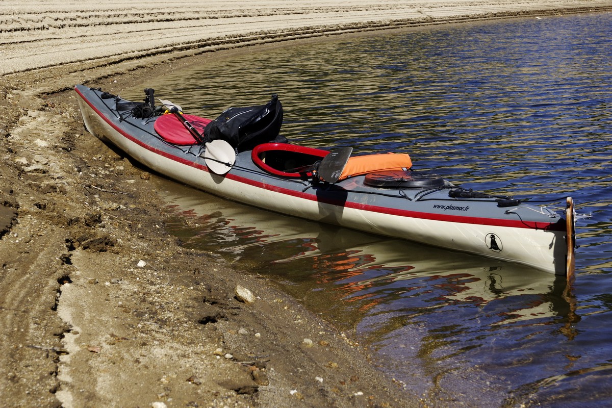 Sur la photo ci-dessous, vous admirez un très bel effet d’optique, pas vraiment calculé sur le coup… Les rochers du premier plan et la plage à gauche de la photo ne sont pas sur la même berge que les arbres derrière. De même que les arbres de gauche ne sont pas sur la même berge que les autres arbres… Un méandre de l’Arn contourne une crête rocheuse juste devant le kayak. Cette crête est signalée à la belle saison par une bouée orange afin que les pilotes des bateaux pensent à bien la contourner même quand elle est sous l’eau… Le niveau du lac est tellement variable qu’il est plus prudent de bien arrondir le virage plutôt que de couper tout droit !